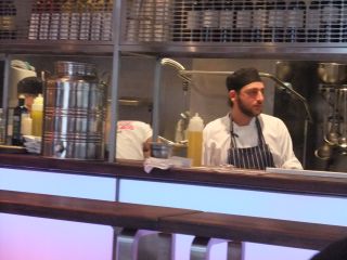 店員さんは、黒いTシャツに黒いエプロン、コックさんは白いコックコートに紺地に白い縦じまのエプロンをしています。このエプロンは良く本にも載っていたので欲しい~!!