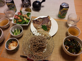 献立は、ベビーほうれん草と玉葱とトマトとムール貝のサラダ、鯛の兜焼き、緑茶、モズクとオクラの酢の物、トロロ蕎麦、モロヘイヤとキクラゲと椎茸のスープに胡麻油を落して、です。